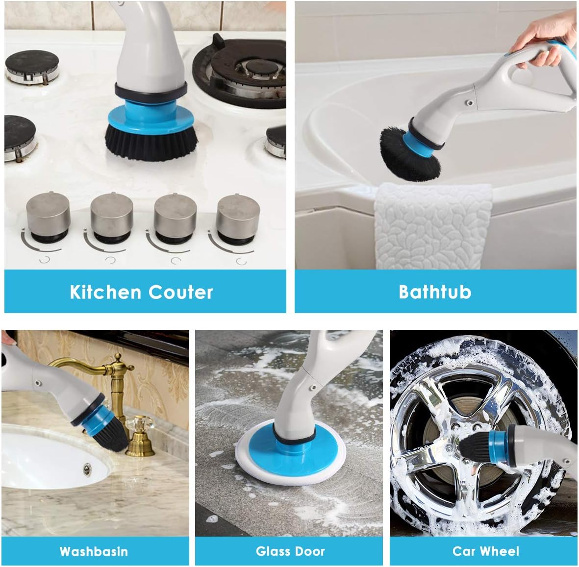 - 【Multiple Brush Heads】- Rechargeable spin scrubber comes with four replacement scrubber heads to meet different cleaning needs. The flat brush is great for cleaning tile and floor; The hemispheric brush is perfect for cleaning sink or bathtub; The corner brush is suitable for cleaning tyre, window sill, and so on.