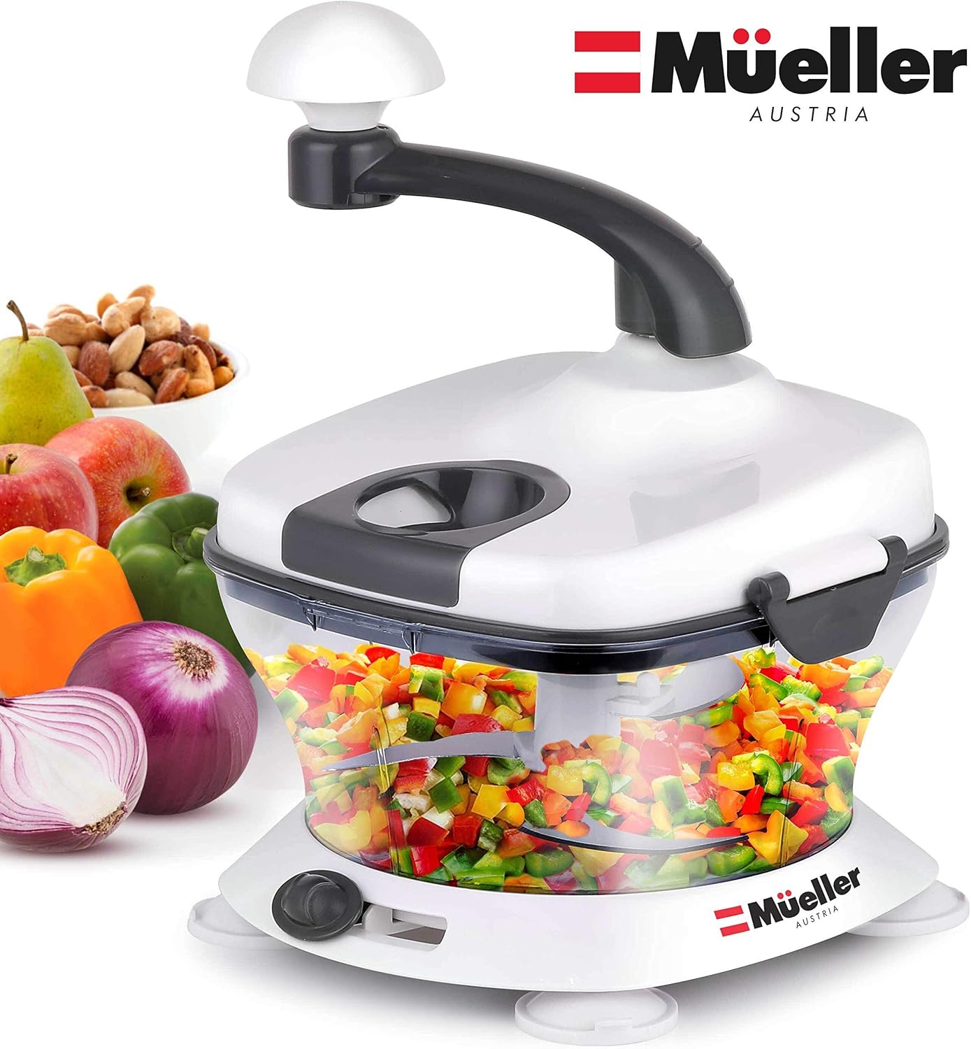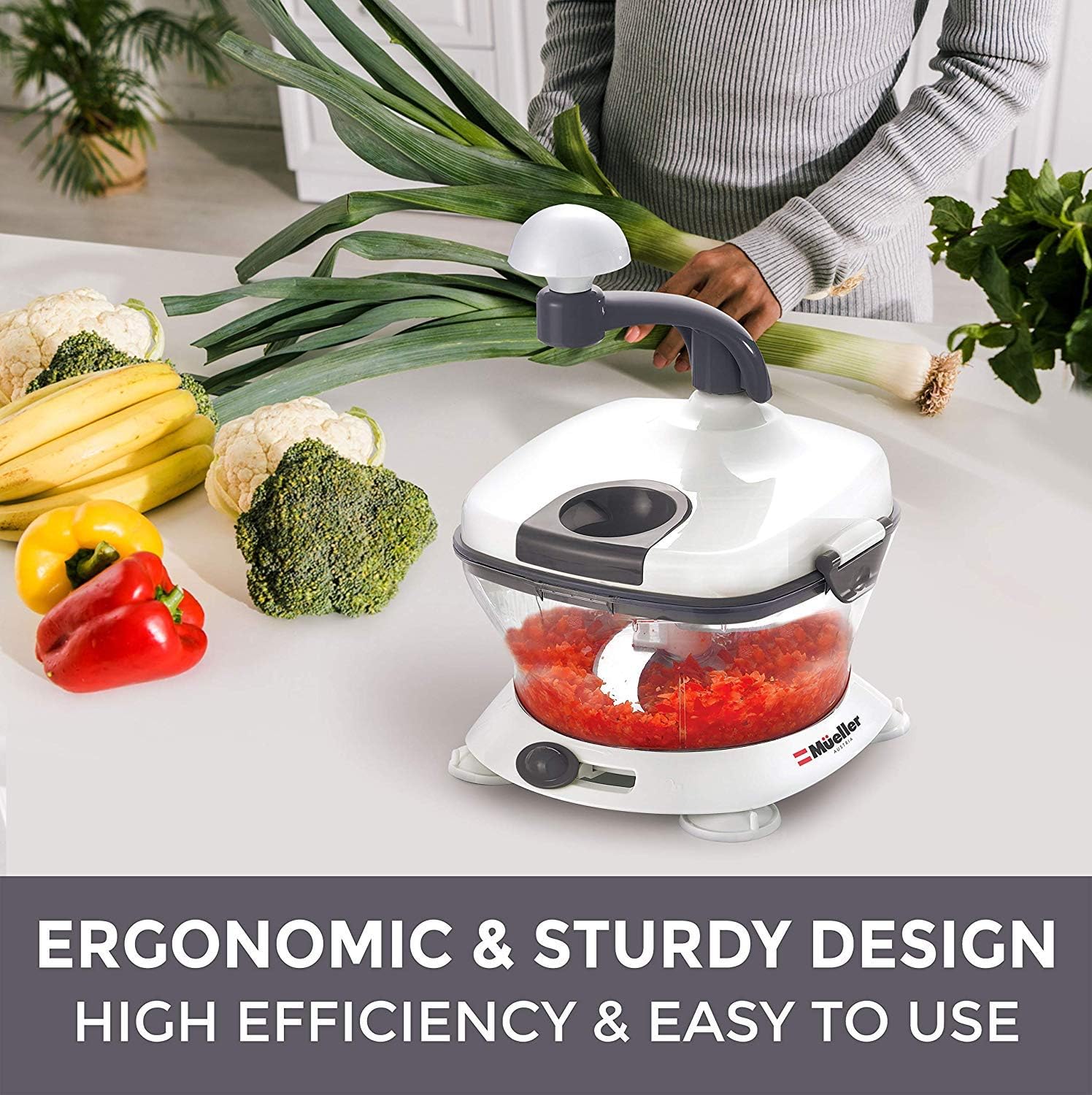 fast and even chopping. Equipped with an anti-skid base, handle, and